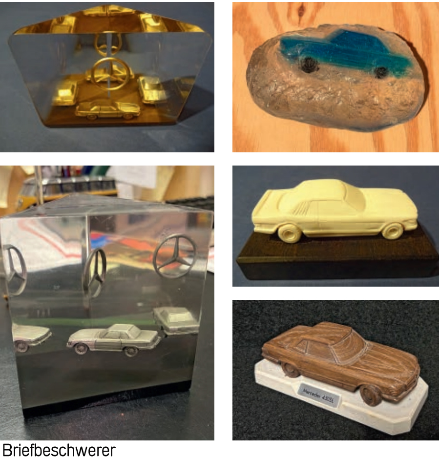 Ich habe keine detaillierten Nachforschungen gemacht, aber einige offensichtliche Modelle fallen mir ein: Mercedes 300 SL Flügeltürer, Jaguar E-Type, Ford Mustang, Porsche 911, Chevrolet Corvette, VW Käfer? Auch wenn mir keine wissenschaftlichen Daten vorliegen, weiß ich doch, dass die Zahl der Artikel, die die Form unseres R 107 nachbilden, groß ist und weiter wächst.