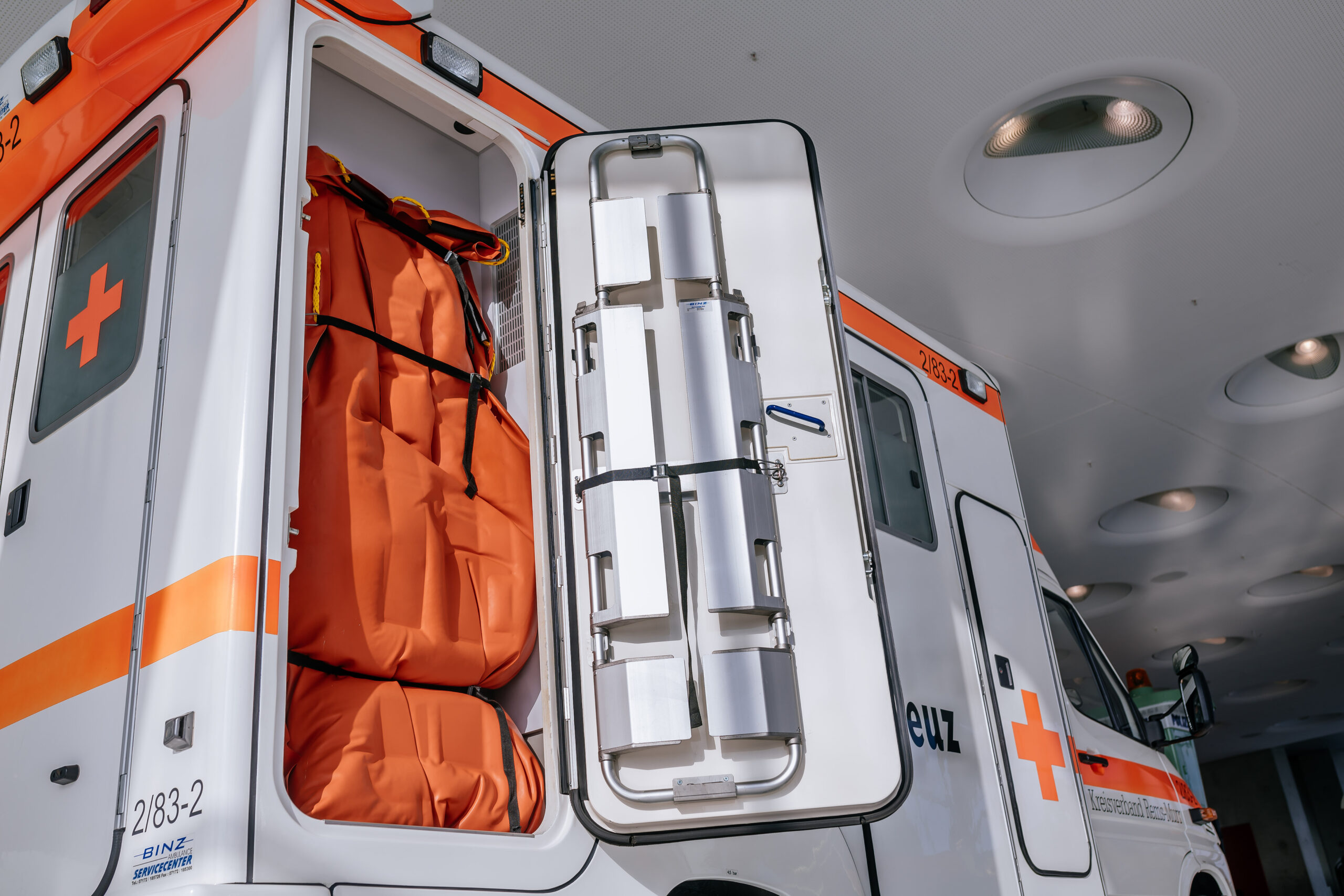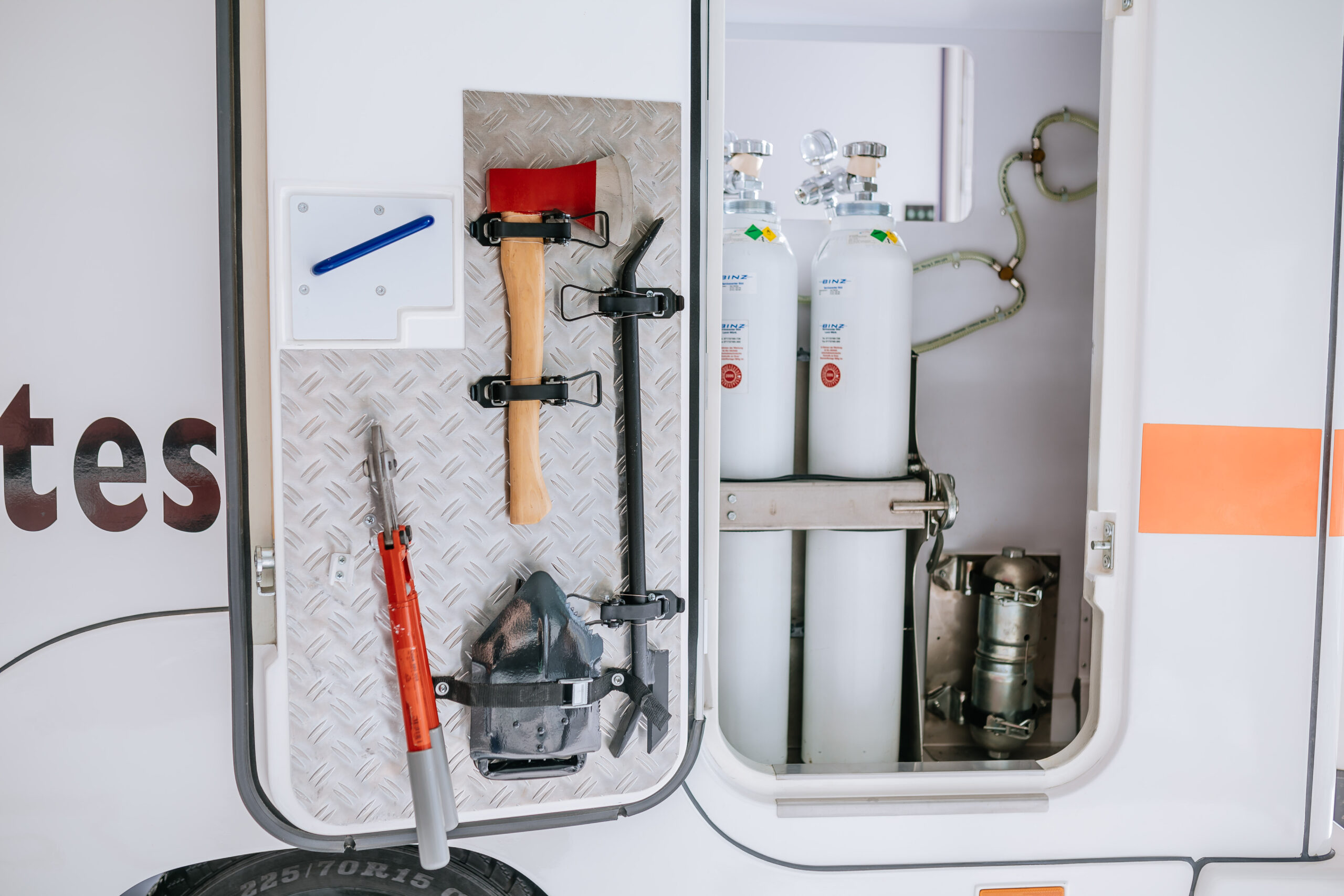 Komplett ausgestattet: Wichtige Rettungsausstattung befindet sich in unmittelbarer Nähe der Trage, etwa ein Defibrillator zur Stabilisierung der Herzfunktion und ein Beatmungsgerät. Beides kann auch außerhalb des Fahrzeugs verwendet werden. Für die Beatmung während der Fahrt gibt es einen eigenen Vorrat an medizinischem Sauerstoff. Mobil sind auch die Handkoffer mit medizinischem Material sowie Medikamenten: Sie befinden sich in den Schrankfächern – von innen und von außen gleichermaßen zugänglich. Dafür hat das Fahrzeug neben der Seitentür eine Klappe. So kann sich das Rettungspersonal mit aller notwendiger Ausrüstung um die Erstversorgung kümmern und dann nahtlos im Auto seine Arbeit fortsetzen. Weiteres Material befindet sich in den umfangreich vorhandenen Schubladen- und Schrankfächern. Ein Schiebefenster vorn an der Kabine ermöglicht eine Blick- und Sichtkommunikation mit dem Fahrer.