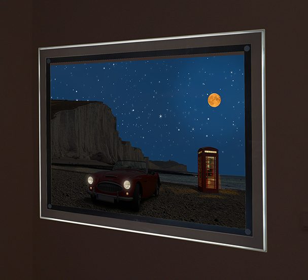 Kurz beschrieben handelt es sich um Day & Night-Bilder von Oldtimern, die in einem LED-Leuchtrahmen geliefert werden. Schaltet man in diesem Leuchtrahmen das Licht ein, „verwandelt“ sich das Tages- in ein Nachtbild. Beim Fahrzeug leuchten Scheinwerfer oder Rücklichter auf, die ganze Szenerie wird zu einem eindrucksvollen Nachtmotiv. Alles, was man für die Anfertigung eines solchen Kunstwerkes benötigt, sind geeignete Fotos, die die Klassiker-, Old- oder Youngtimerbesitzer/innen samt Ihrer Vorgaben einsenden. Diese Fotos werden von Day & Night (Brigitte und Joachim Wischermann) in der Steiermark/Österreich grafisch umgearbeitet, in einem speziellen Verfahren gedruckt und schließlich in einen Leuchtrahmen eingelegt.