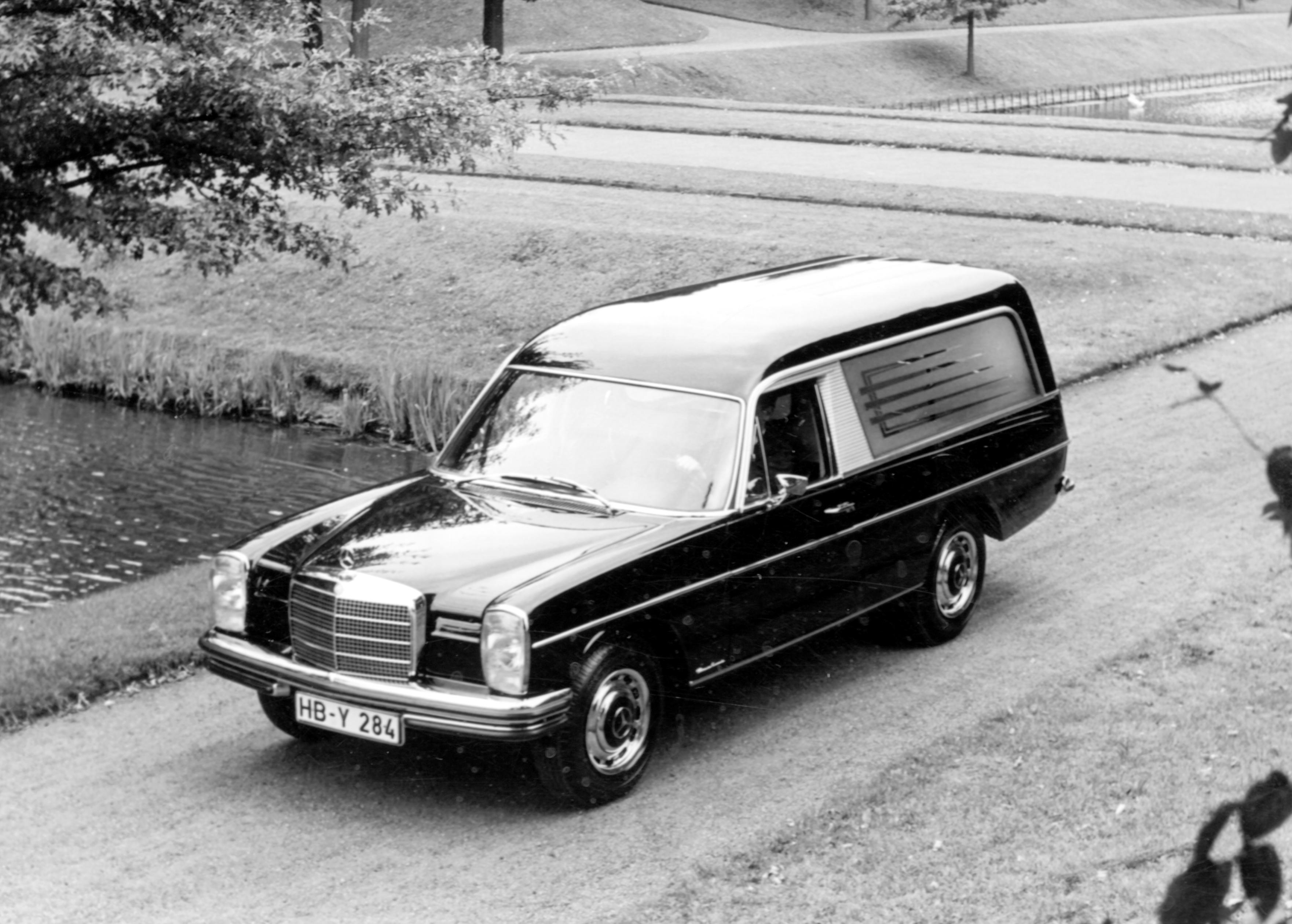 Für die letzte Reise: Bestattungsfahrzeug auf einem Fahrgestell vom Typ Mercedes-Benz 230, 1968 bei Pollmann gebaut.