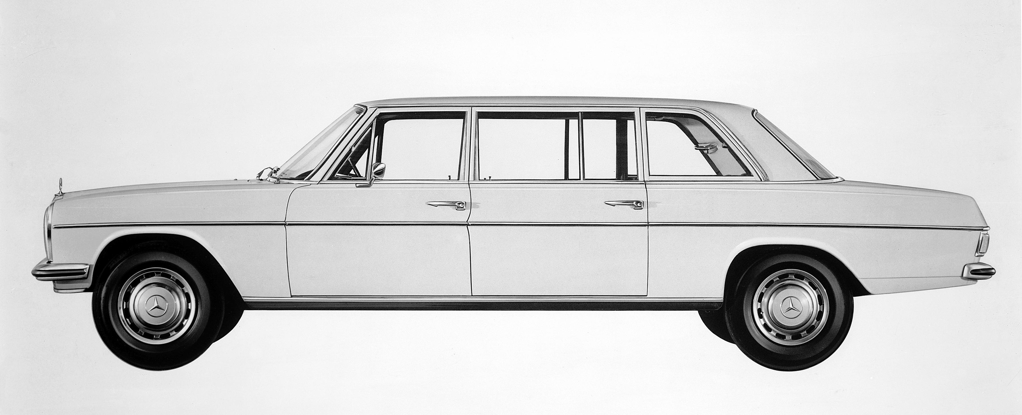 Noch exklusiver – zumindest was Preise und Stückzahl angeht – fällt eine dritte Karosserievariante aus, die Mercedes-Benz im Dezember 1968 vorstellt: Die Limousine mit einem um 65 Zentimeter verlängertem Radstand bietet auf drei Sitzreihen dem Fahrer und sieben Passagieren Platz. Eine Achtsitzer-Limousine gab es bereits schon bei der kleinen Heckflosse. Zunächst ist diese teuerste und in geringster Stückzahl – es sind dennoch fast 10 0000 Stück – produzierte Variante des Strich-Acht als Typ 220 D und 230 lieferbar. Im Herbst 1973 kommt der 240 D dazu.