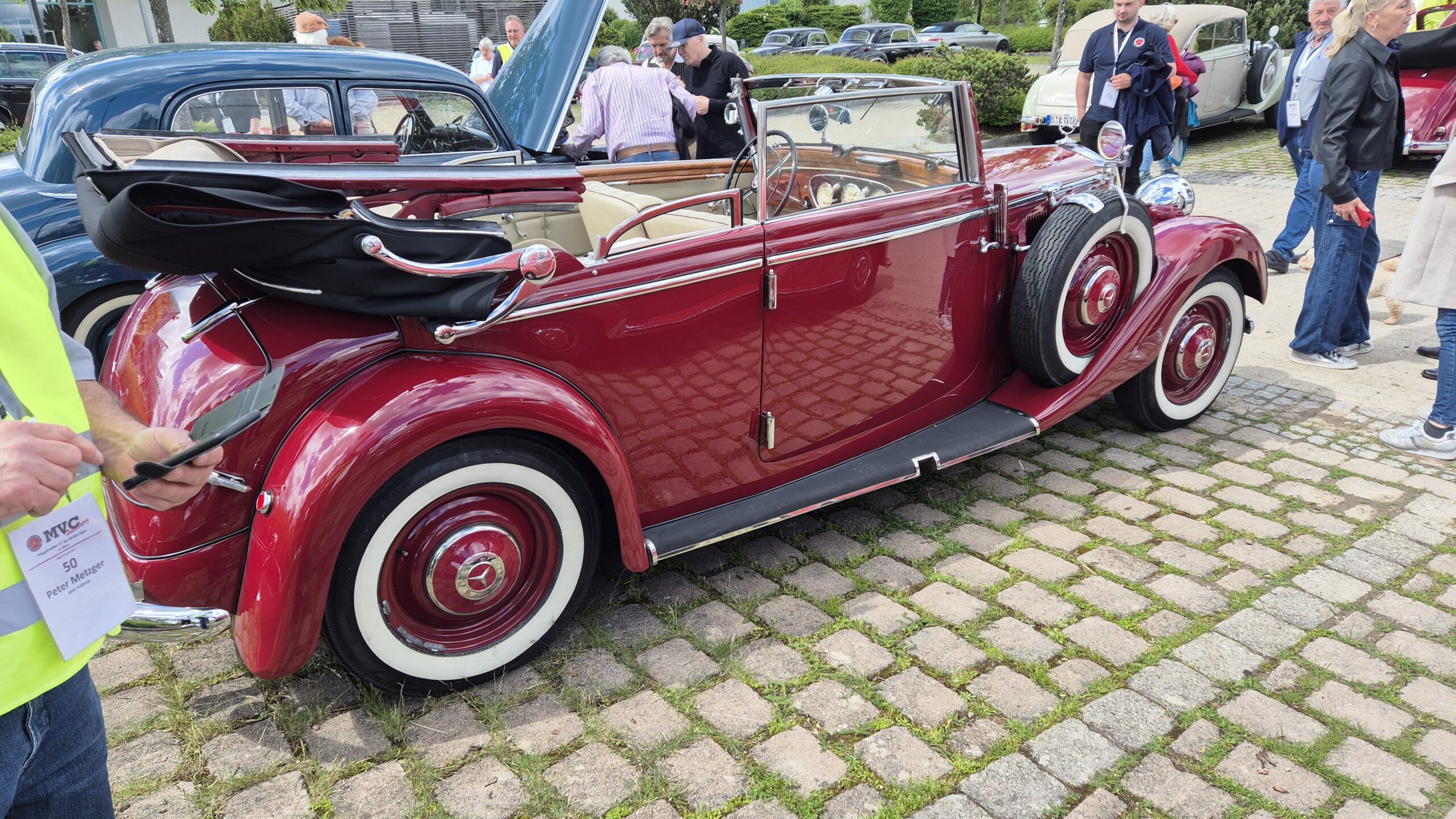Am Sonntag steht ja traditionell die Ausfahrt im Mittelpunkt. Da ich nicht selbst mit einem Klassiker angereist war, suchte ich nach einer Mitfahrgelegenheit… und beim Start stellte sich heraus, dass ich bei unserem MVC-Präsidenten Uwe Ewald und seiner Frau im 170S Cabriolet B von 1950 mitfahren durfte.