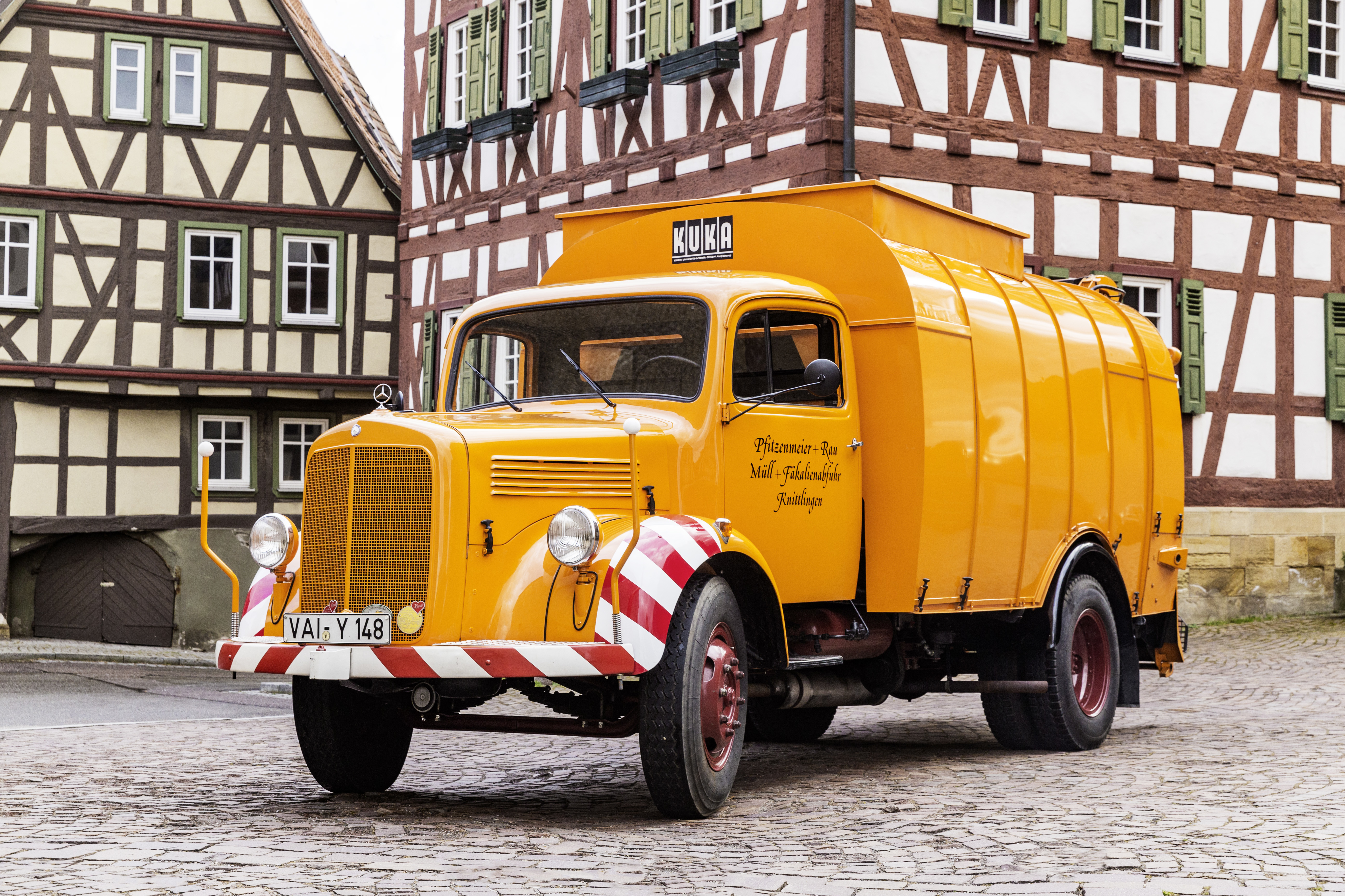 Ein Müllwagen LM 311 von 1955 belegt den gewaltigen technischen Fortschritt, den Mercedes-Benz bis hin zum heute weit verbreiteten Müllsammelfahrzeug auf Econic-Basis vorangetrieben hat. Die Allradversionen des 311er galten mit den – für damalige Zeiten – riesigen Zwillings-Hinterrädern als regelrechte Offenbarung in der Klasse der geländegängigen Fahrzeuge seiner Zeit.