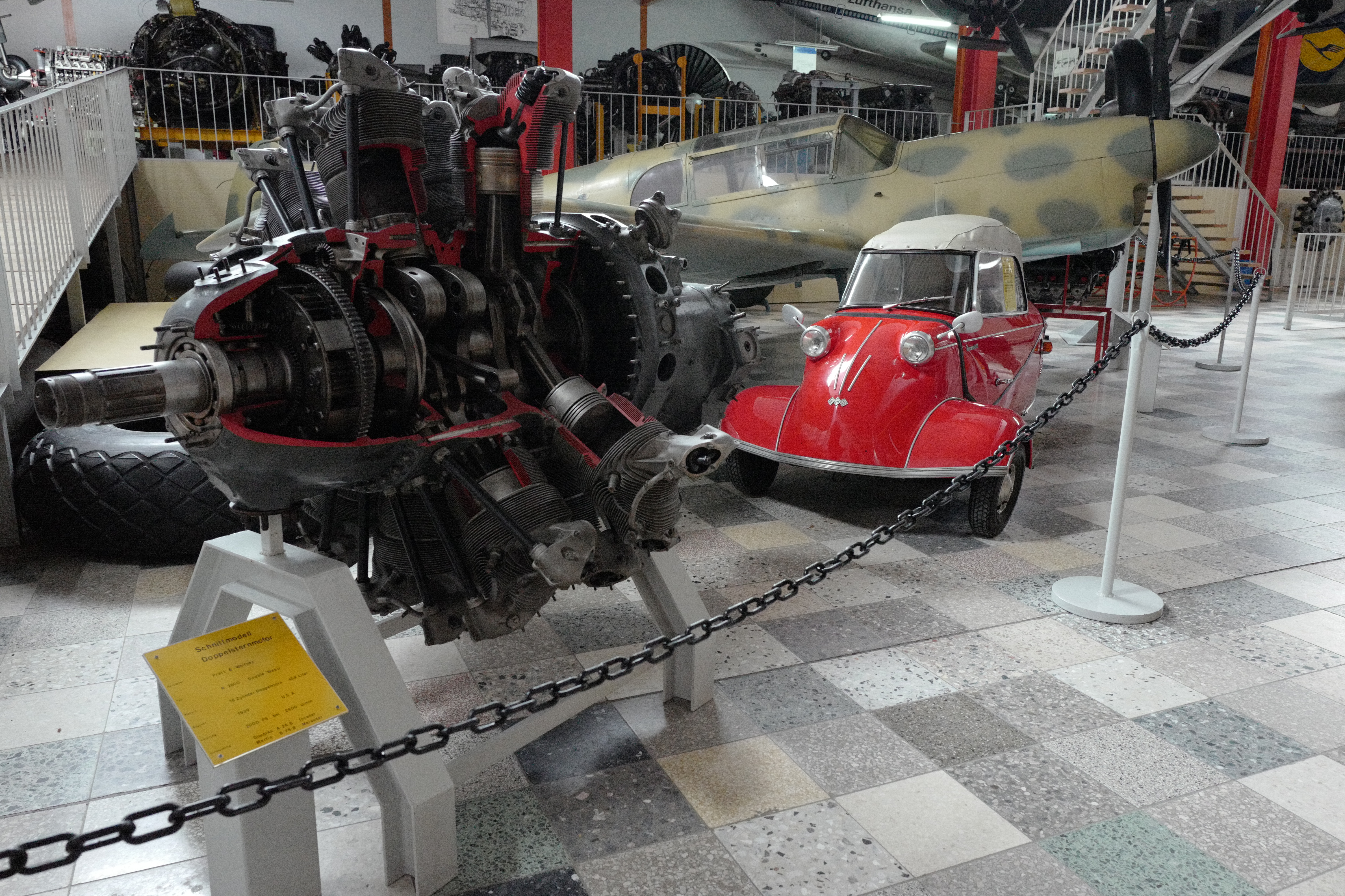 In einer anderen Halle steht eine Anzahl von Flugmotoren. Hierzu zählen auch offene Exemplare, an denen man die Technik sehen kann. Hierzu zählt auch ein Motor von Daimler Benz, ein DB 720 /PTL 6, der zwischen 1956 bis 1962 gebaut wurde.