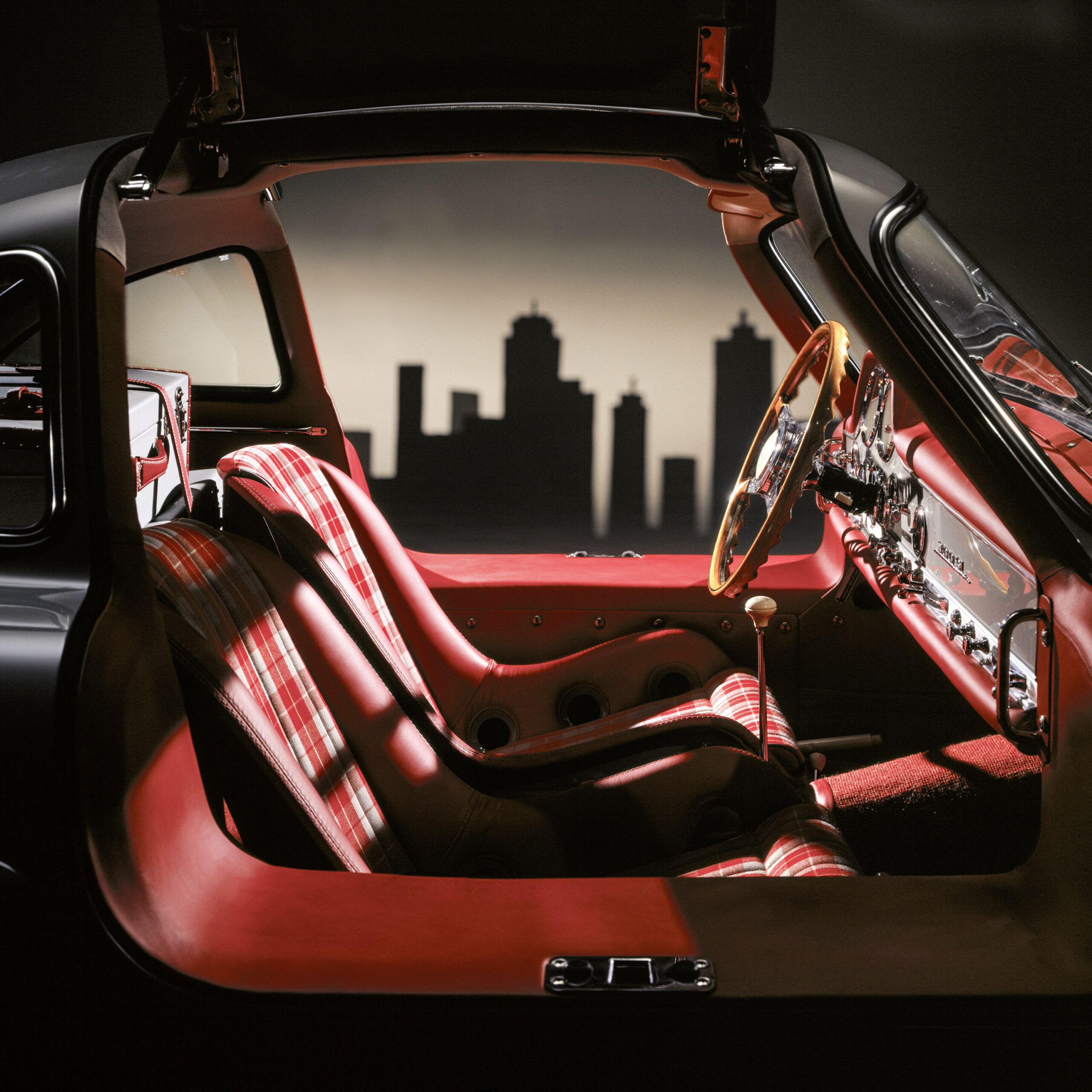 Aber in der angehängten Bildergalerie ist nicht nur das historische Bild von der Präsentation in New York, besonders wichtig erscheint mir das Bild mit dem Flügeltürer vor der Manhatten Kulisse. Dieses Motiv ist im Jahr 2011entstanden und real fotografiert im Studio Leonberg entstanden, und das Fahrzeug ist tatsächlich der Originalwagen von der New Yorker Motorshow von 1954.