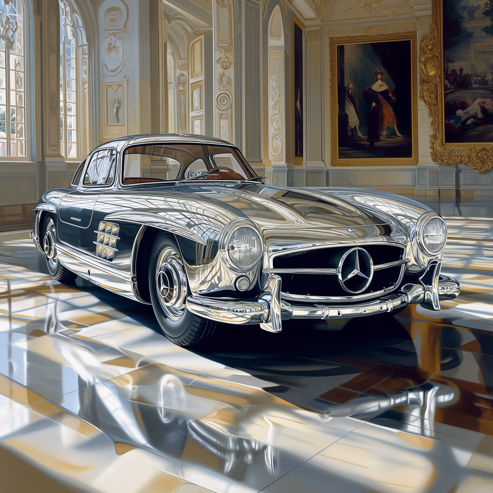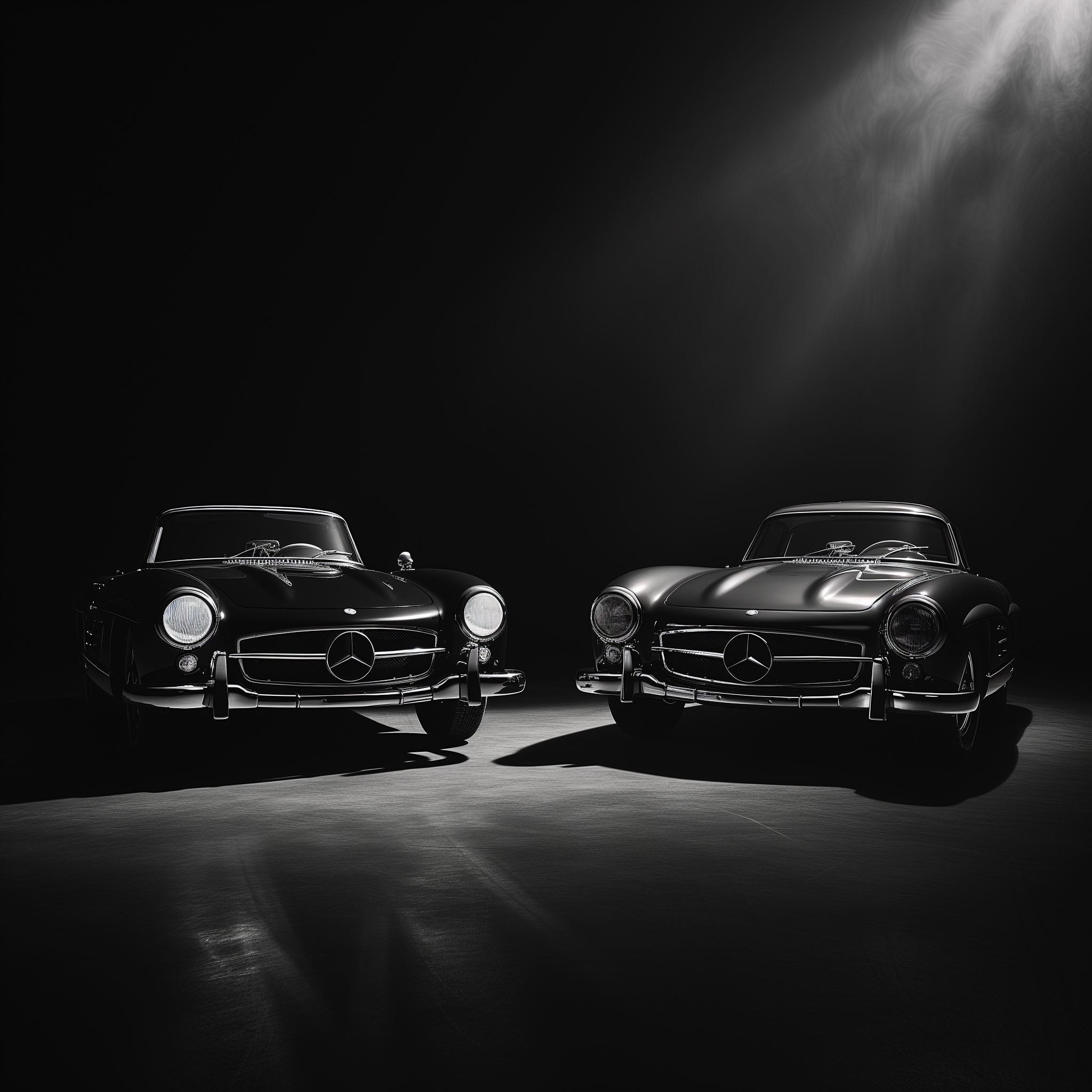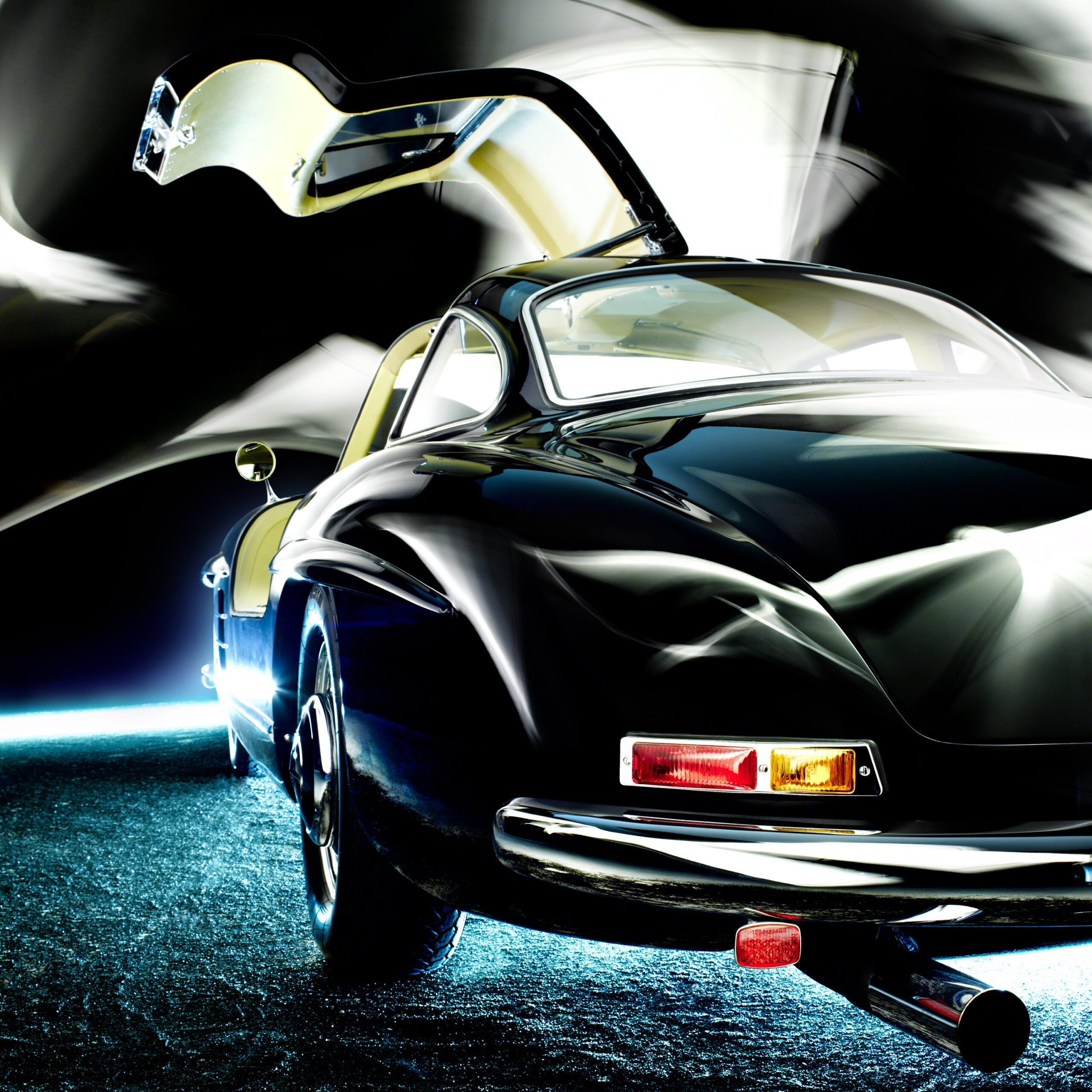 Man kann es nur an der Bildnummer erkennen, aus welchen Jahren die einzelnen Bilder sind. Immerhin waren es alleine 25 Jahre in denen ich meinen jährlichen 300 SL Kalender produzierte. Besonders hervorzuheben sind beiden neuen Bilder, der etwas künstlich inszenierte Flügeltürer und das Pärchen, diese beiden Motive sind erst diese Woche entstanden – ohne reale Fahrzeuge, ohne reales Licht, ohne eine Kamera, nicht einmal ein Studio habe ich dazu gebraucht und so gut wie keine Arbeitszeit. Weder meine noch die vom Team der MediaMonks, mit denen ich ganz eng bei allen Themen der KI zusammenarbeite.
