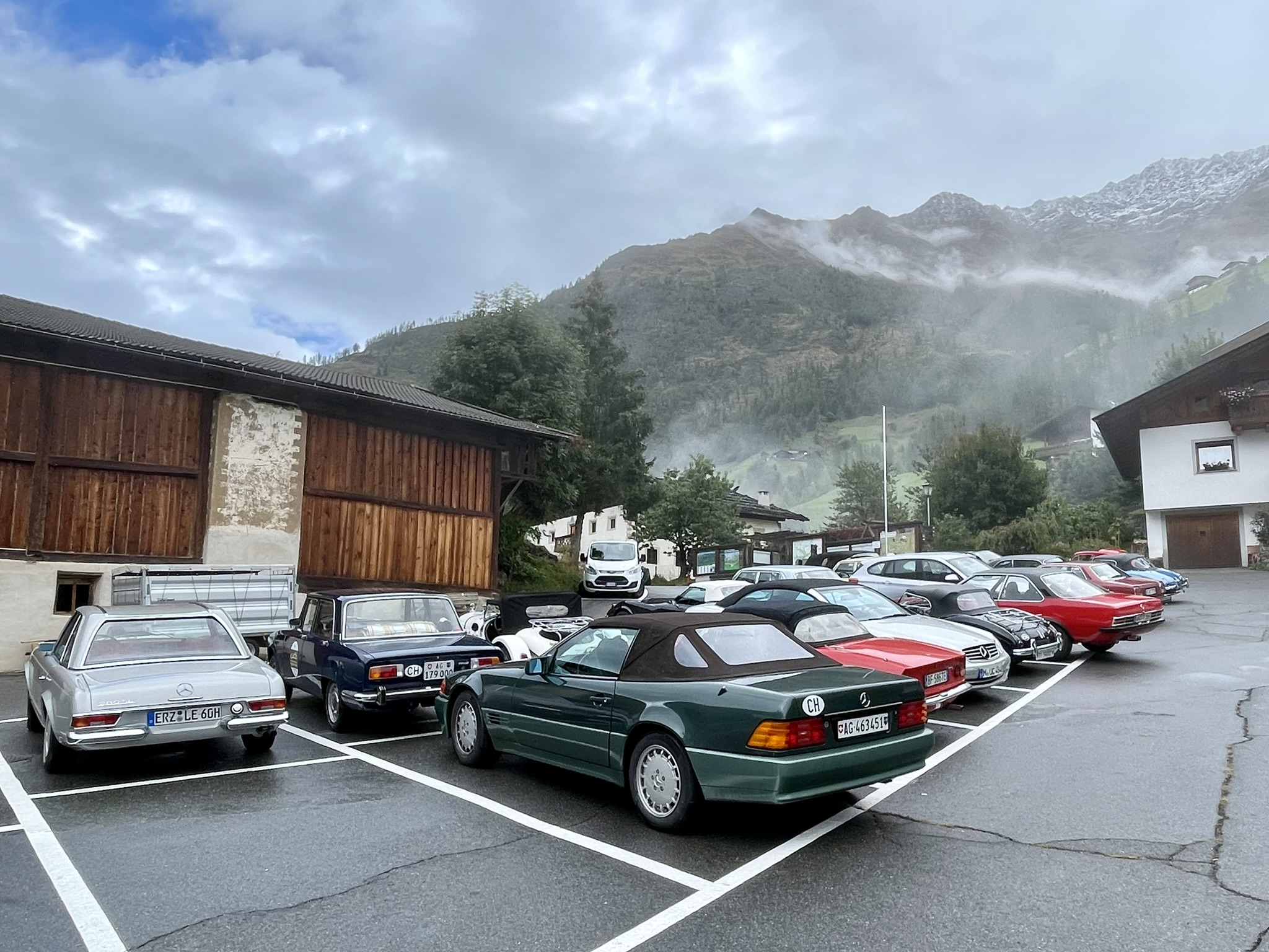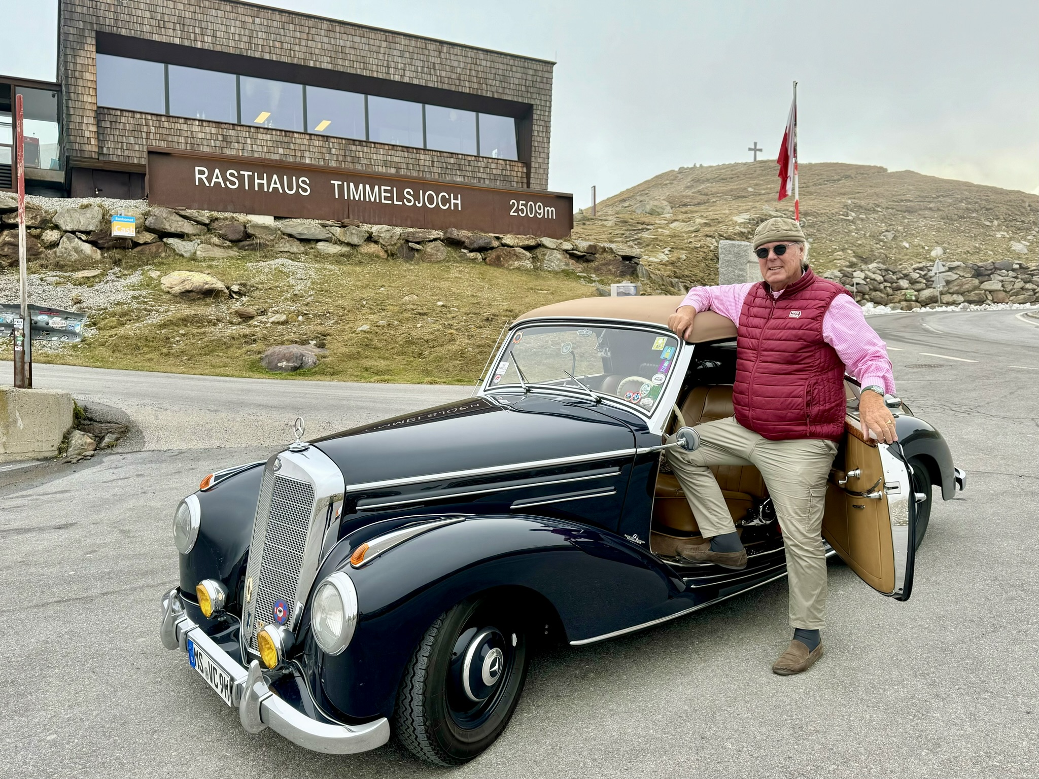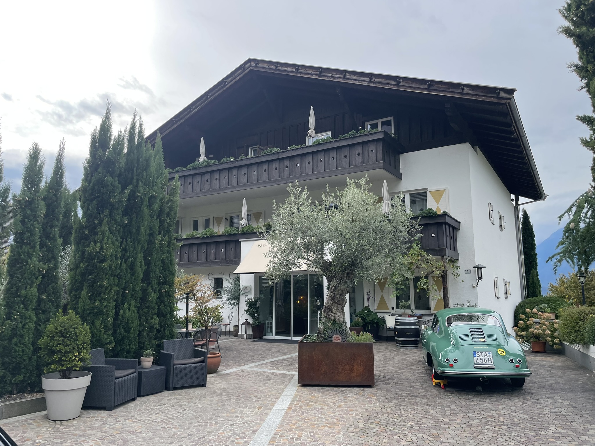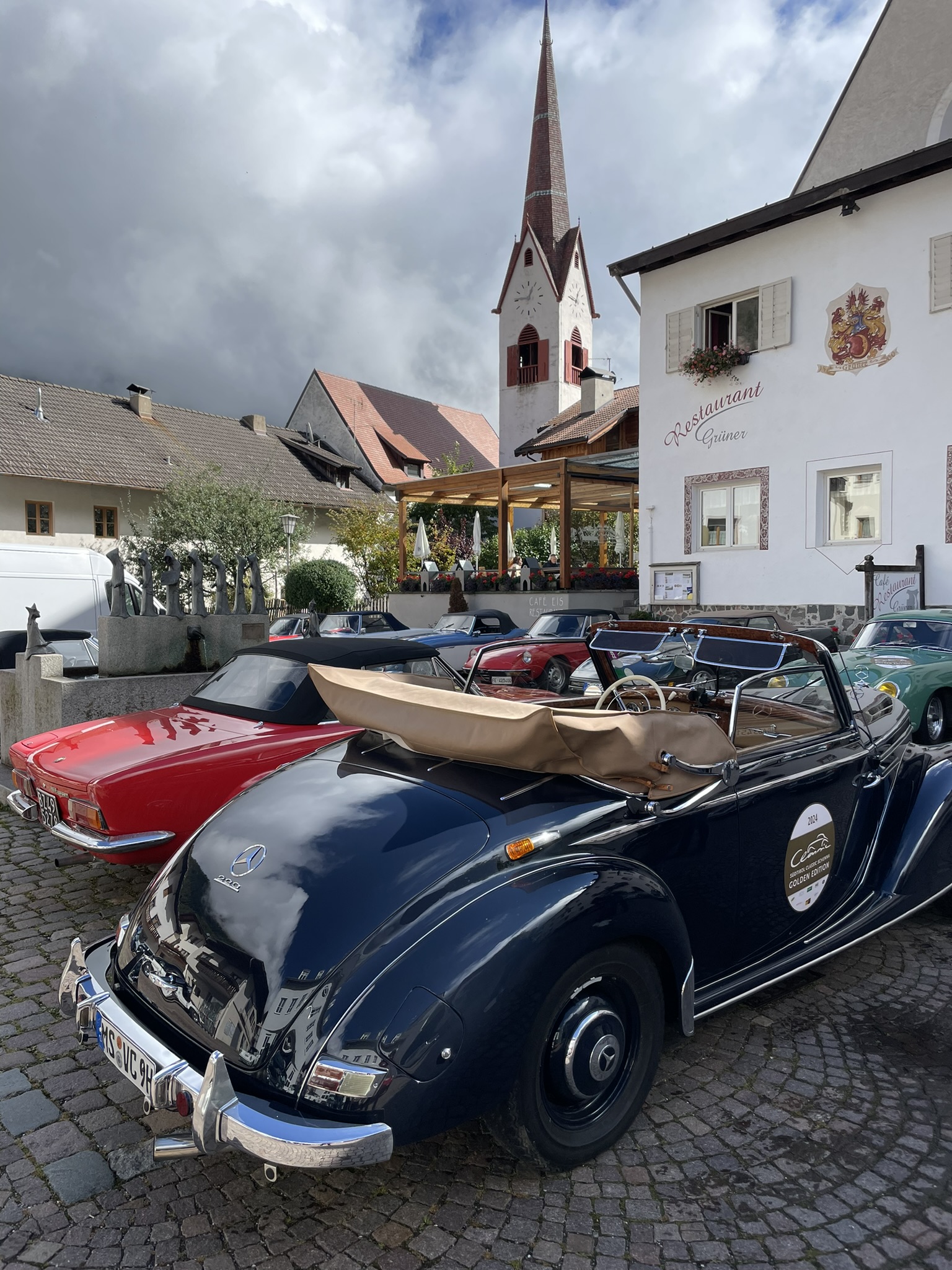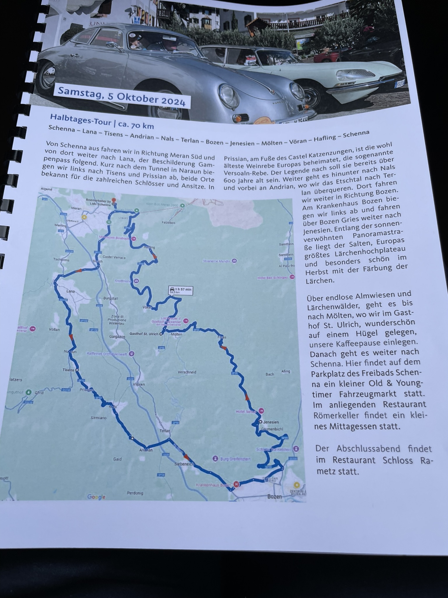 Über Würzburg per A7 zum Fernpass, durchs Inntal und übers Timmelsjoch nach Südtirol. Am 01.10. Ausflug nach Dorf Tirol, Werkstattbesuch wegen abgebrochener Rücklehnen-Halterung des Fahrersitzes. Durch Kontakte unseres Hoteliers, dem langjährigen Tourismusdirektor von Schenna und bewährten Organisators der „Südtirol Classic Rallyes“ Franz Innerhofer fanden wir eine sehr kompetente und kundenorientierte Oldtimer-Sattlerei in Lana: „Cabriodach Rainer“, die den Sitz über Nacht reparierte. Eröffnungsabend der Südtirol-Classic Golden Edition 2024 im Schenna Resort.