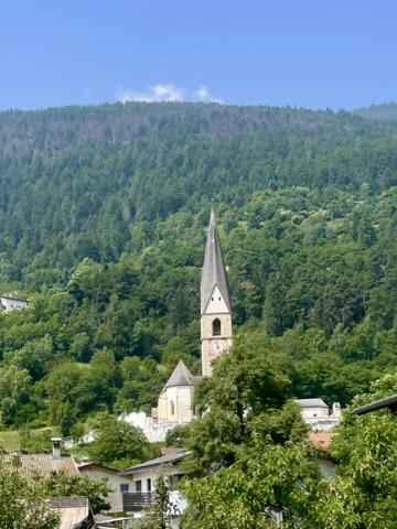 Am nächsten Morgen ging’s per Landstraße durchs Allgäu nach Pfronten/Reutte und anschließend über den Fernpass nach Tirol. Am „Zugspitzblick“ war eine erneute Pause angesagt, die wir bei herrlichstem Wetter und mit großartigem Ausblick auf den höchsten Berg Deutschlands genossen. Danach fuhren wir runter ins Inntal, blieben auch da auf der Landstraße und durchquerten Landeck. Von dort hinauf zum Reschenpass, am Reschensee (mit dem im Wasser stehenden Kirchturm) vorbei und über die italienische Grenze weiter nach Mals im Vinschgau. Dort kehrten wir wie schon häufig zuvor im Hotel „Hirschen“ ein: familiengeführt, große und saubere Zimmer (teils mit freiem Blick auf den Ortler) und ein außergewöhnlich reichhaltiges und leckes Frühstück mit Vinschgerln!