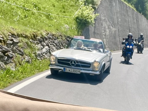 Die zweite Überraschung war, dass Cornel während Angelas leckerem Frühstück mit perfekt gekochten, weichen Frühstückseiern spontan sagte: „Ist doch kein Problem, dann nimm doch meine andere Pagode!“ Nach kurzem Überlegen, ob das gesamte Gepäck aus dem T-Modell in die Pagode passen würde, entschloss sich Horst, das überaus großzügige Angebot anzunehmen. Und siehe da: obwohl seine Frau Sabine im Glauben, sich wegen des T-Modells in Bezug auf ihr Gepäck nicht beschränken zu müssen, passte alles in die Pagode! Also konnte sich Carlos 220er umrahmt von zwei Pagoden in Bewegung setzen.