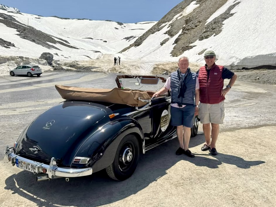 Sabine und Horst wagten mit Carlo und Gert die Auffahrt zum Stilfser Joch, das Carlos 220er bislang nur über den Schweizer Umbrailpass erklommen hatte. Da Carlo und Gert am 5. Juli 2025 zur 200-Jahr-Jubiläumsfahrt (https://mvcoldtimerticker.de/jubilaeumsfahrt-200-jahre-stilfser-joch/, www.200stelvio.com) die Auffahrt über Trafoi nehmen sollten, war dies eine Art Generalprobe. Und: der 220er hielt durch – so kamen wir problemlos oben auf der Passhöhe am Rand des im Sommerskigebietes an. Zurück fuhren wir über den Umbrailpass in die Schweiz und durch das Val Müstair wieder zurück nach Mals.