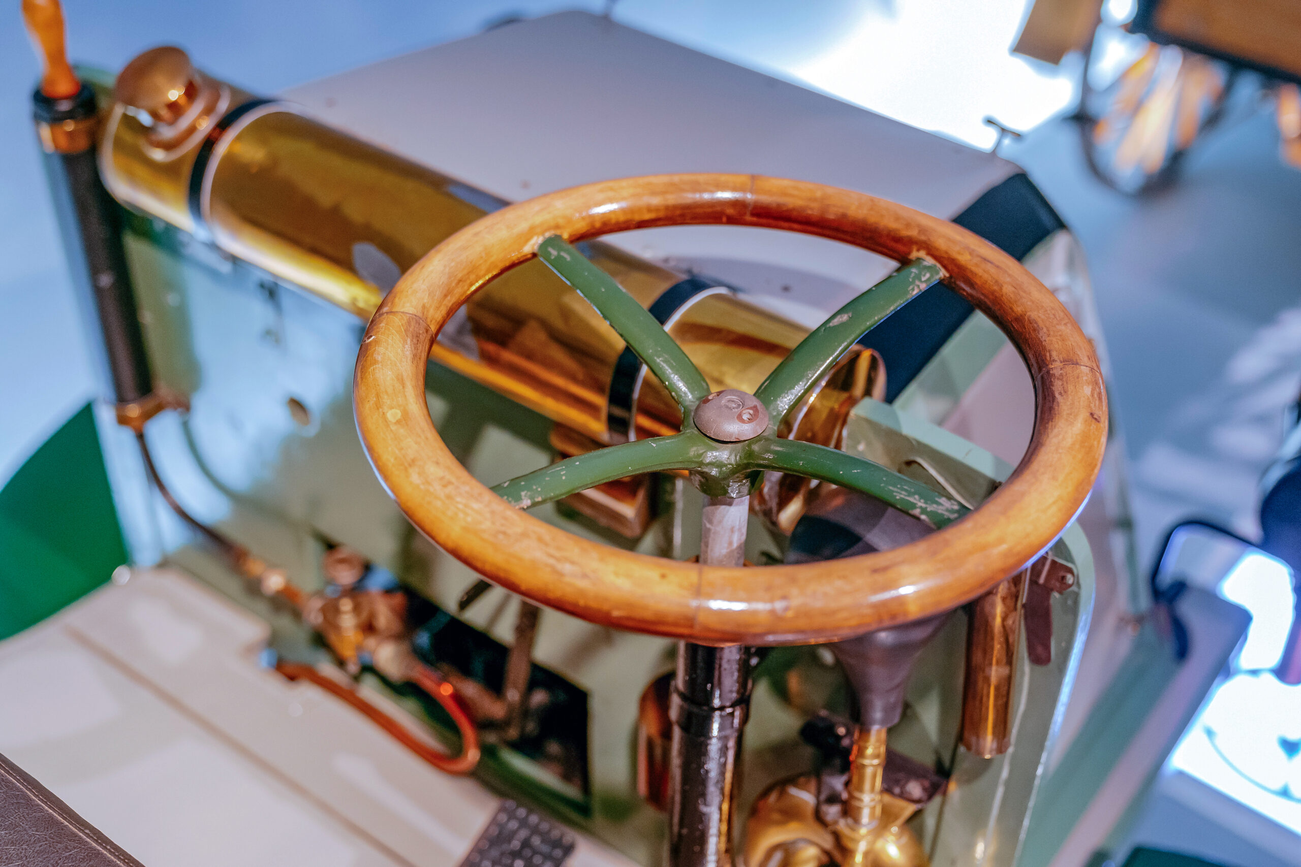 Innovationsträger mit Fuhrwerkgenen: Gegenüber der Abbildung in der ersten Verkaufsanzeige verändert sich das Fahrzeug bald. 1897 ist es noch ein Lieferwagen mit Motor unter der Sitzbank und frei stehender Lenksäule. Der Motor-Geschäftswagen von 1899 im Museum hat hingegen einen über der Vorderachse platzierten Motor, den eine hoch aufragende Haube schützt. Direkt darunter befindet sich der Röhrchenkühler mit der Anlasskurbel in seiner Mitte. Diesen innovativen Details stehen traditionelle Lösungen gegenüber: Der Fahrer sitzt auf einer offenen Bank ohne Wetterschutz. Sie ähnelt dem Arbeitsplatz eines Kutschers, der mit seinem Fuhrwerk Waren ausliefert. Aus der Epoche der Kutsche hat sich der Motor-Geschäftswagen dennoch eindeutig verabschiedet: Vor dem Chauffeur befindet sich die senkrechte Lenksäule mit dem hölzernen Lenkrad. Rechts an der Außenseite liegt der Schalthebel mit offener Kulisse. Und Aufmerksamkeit im Verkehr verschafft die große Hupe.
