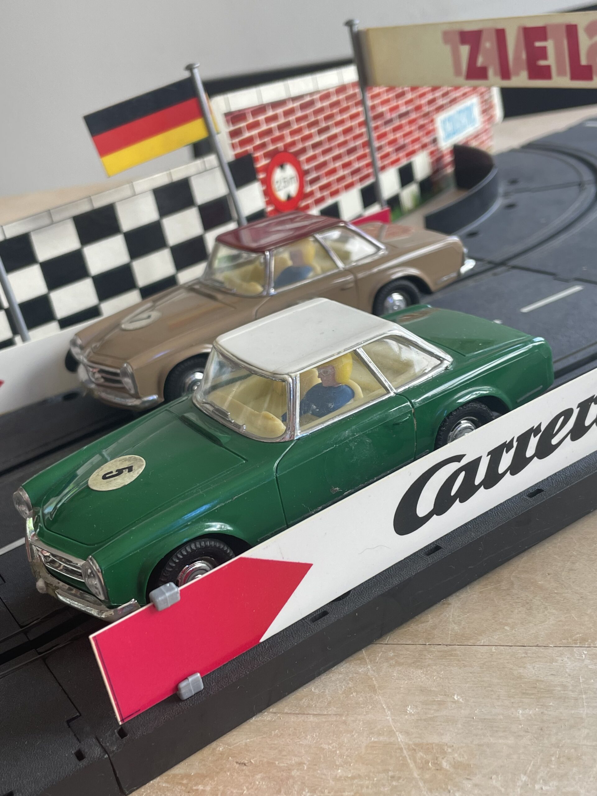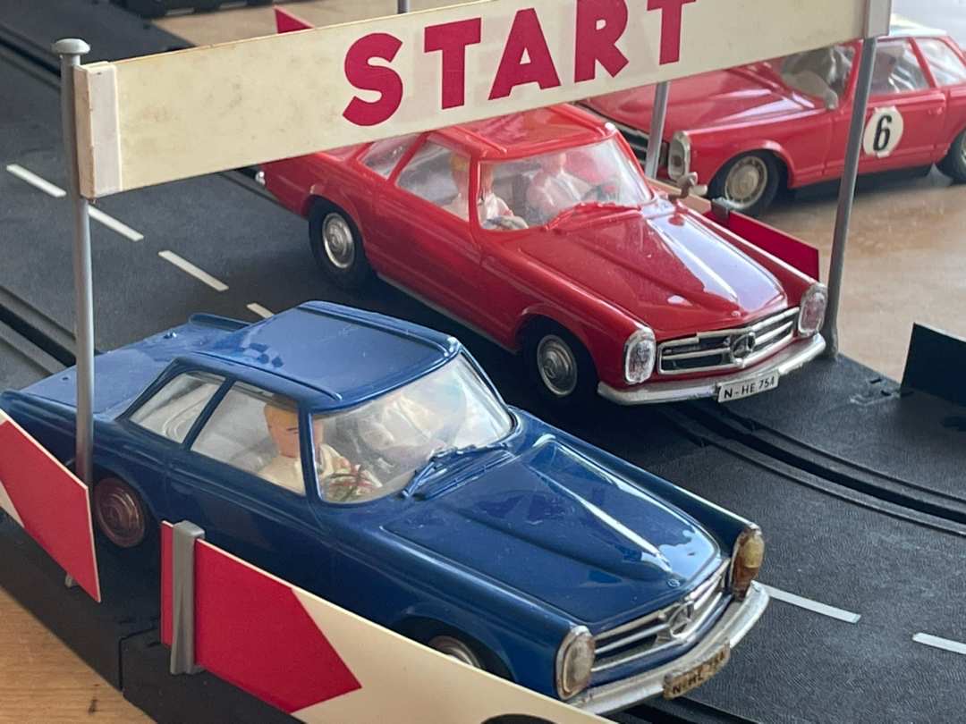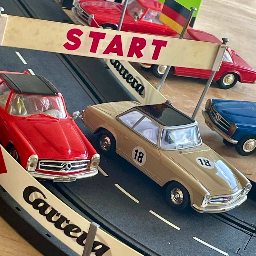 Natürlich spielt auch hier unsere Lieblingsmarke eine gewisse Rolle, Silberpfeile und Gullwings brausten in verschiedenen Modellausführungen über die heimische Piste, aber ein Mercedes-Modell beschäftigte fast jeden Hersteller, obwohl das Auto selbst Im wahren Motorsport-Leben nicht besonders erfolgreich war. Die Rede ist von der Mercedes Pagode. Markenliebhaber erinnern sich vielleicht noch an ein rotes Modell mit Hardtop, das bei der Wettfahrt Spa-Sofia-Lüttich gestartet ist. Aber im Gegensatz zum Porsche 911, der ausgerechnet auch noch im benachbarten Stadtteil „erfunden“ und obendrein mit luftgekühltem Heckmotor In das Rennen um die Gunst des Kunden geschickt wurde, sollte sich die Pagode im Motorsport nicht durchsetzen. Das hielt aber weder Carrera noch Scalextric oder Stabo Car davon ab, dieses schöne Modell in mehreren Varianten zu produzieren und auch Grundpackungen damit zu bestücken.